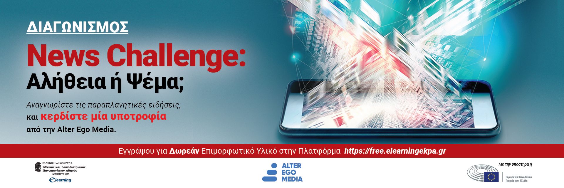 Ολοκληρώστε τη δωρεάν εγγραφή σας στο πρόγραμμα «Παραπληροφόρηση ή Αληθινές Ειδήσεις» και μάθετε πώς μπορείτε να συμμετέχετε στον διαγωνισμό της Alter Ego Media που σας δίνει τη δυνατότητα να κερδίσετε μία υποτροφία σε  i) Μεταπτυχιακά Προγράμματα Σπουδών του ΕΚΠΑ (έως €3.000)  ή  ii)Προγράμματα Επιμόρφωσης του E-Learning ΕΚΠΑ ή iii) στη σχολή δημοσιογραφίας NEW MEDIA STUDIES (έως 5.500 ευρώ).